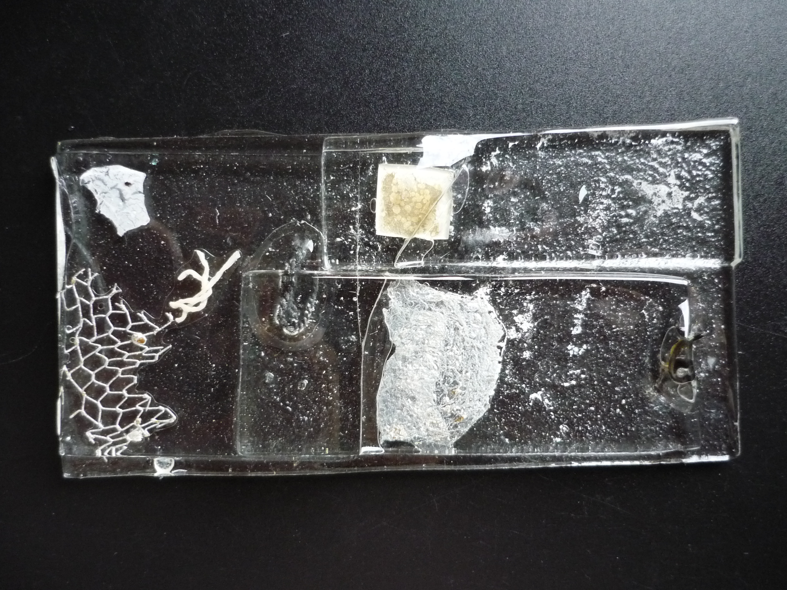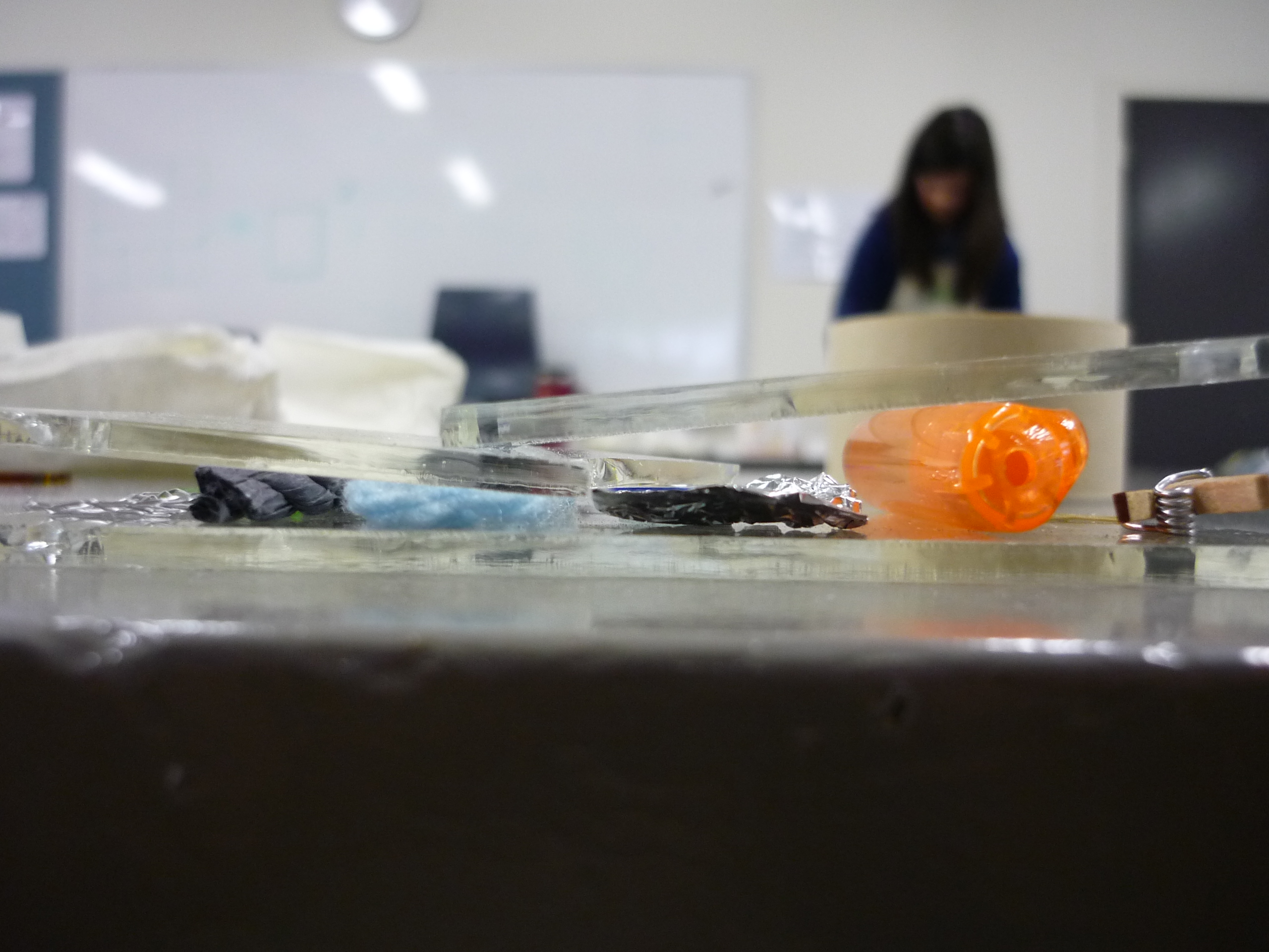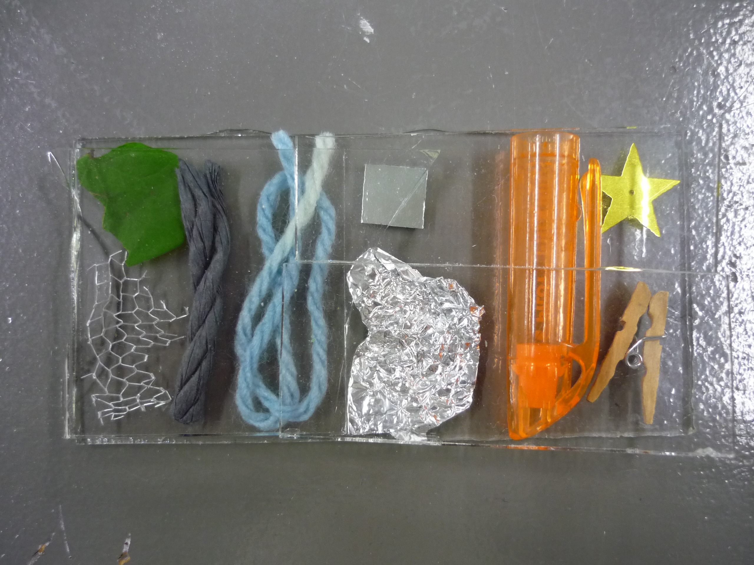 mirror (top), aluminum foil (bottom), cap of a pen, plastic decoration (top), clip (bottom)