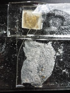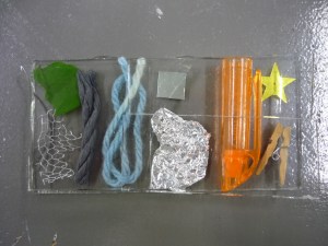 From left – leaf(top), gauze(bottom), paper string, wool,