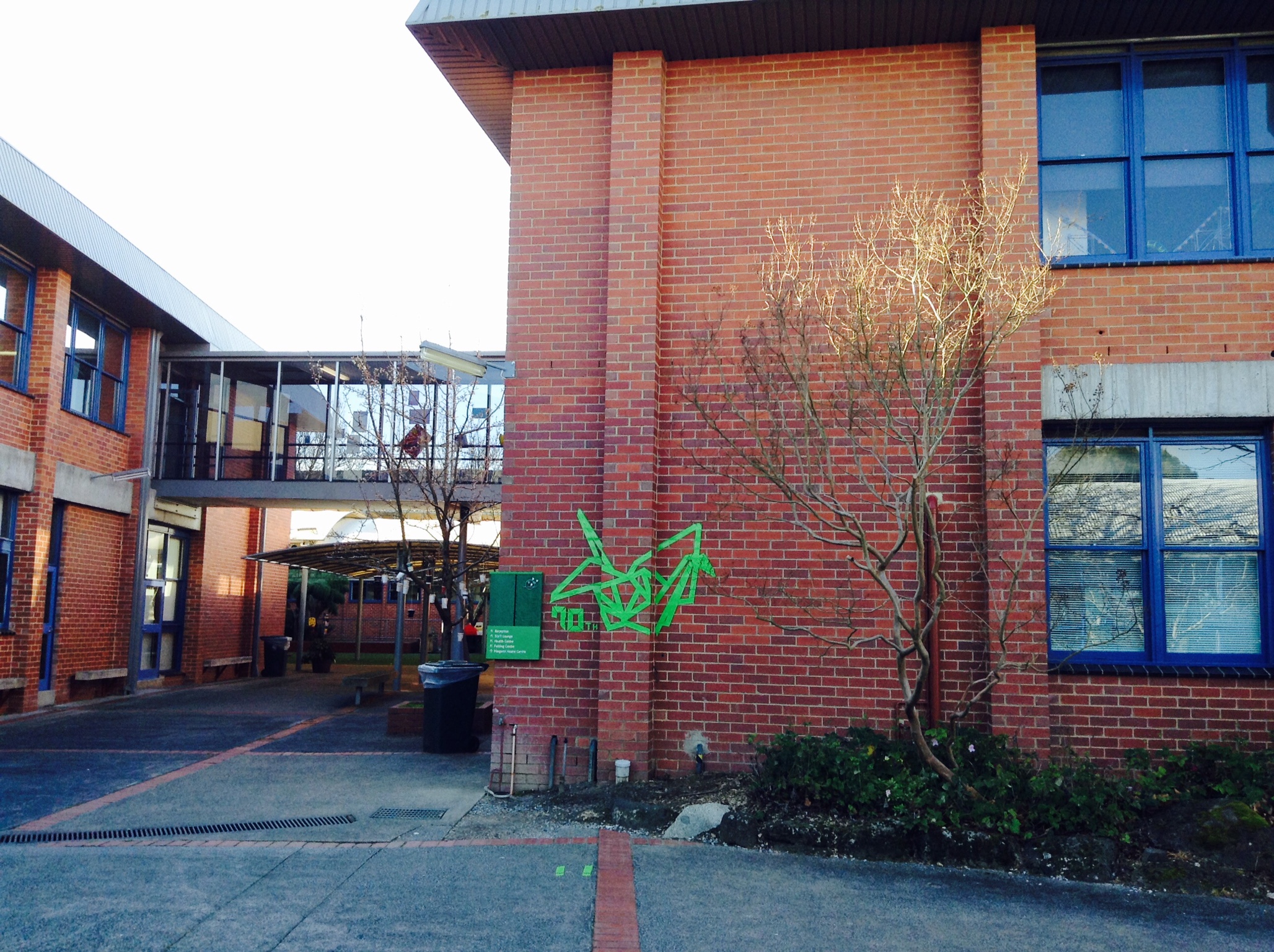 As my response to the time to reflect on the history, I created the installation artwork on the wall of school building using green fluorescent duck tape. I used a video camera that has a function to project images, to project the drawing of a paper crane on the brick wall. I deliberately located the artwork where the section of the wall is uneven, in order to form a specific viewpoint that allows the image of the paper crane to be seen. I decided to leave the word ’70th’ next to the installation to suggest the meaning and the intention of installing this artwork.