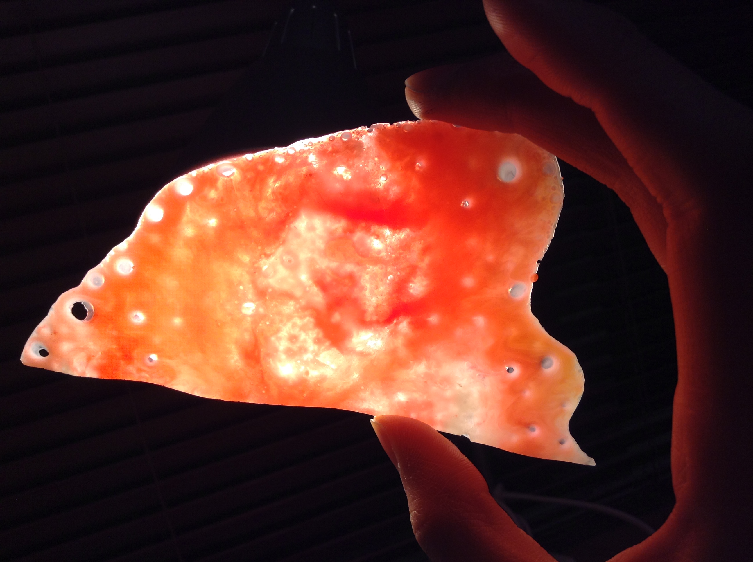 After I put the frying pan away from heat and cooled it down, I placed the melted lollies on the cooking sheet ( on a plate) inside the fridge to cool it down. The lollies layer didn’t take long time to be solidified. I was fascinated by the flowing patterns of organic lines that constructed the mysterious atmosphere on the surface of lollies. Afterwards, I accidentally cracked the layer into three pieces but the sharp and strong edge created by cracking it, contrasted with the feminine sense of the lollies. I decided to take photographs of them using a digital camera and with iPhone. I wasn’t good at setting up proper lighting and so pictures in the first attempt didn’t turn out beautiful. When I was taking photos on iPhone, I came up with an idea of holding it in front of the light and allowing the light to come through the piece. ,this technique clarified the intensity and the transparency of different sections of the lollies. They reminded me of the nebula in the universe.