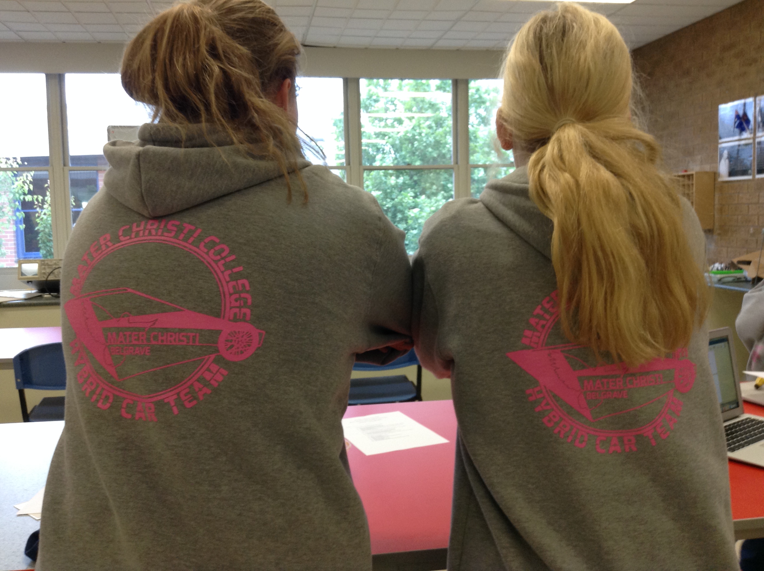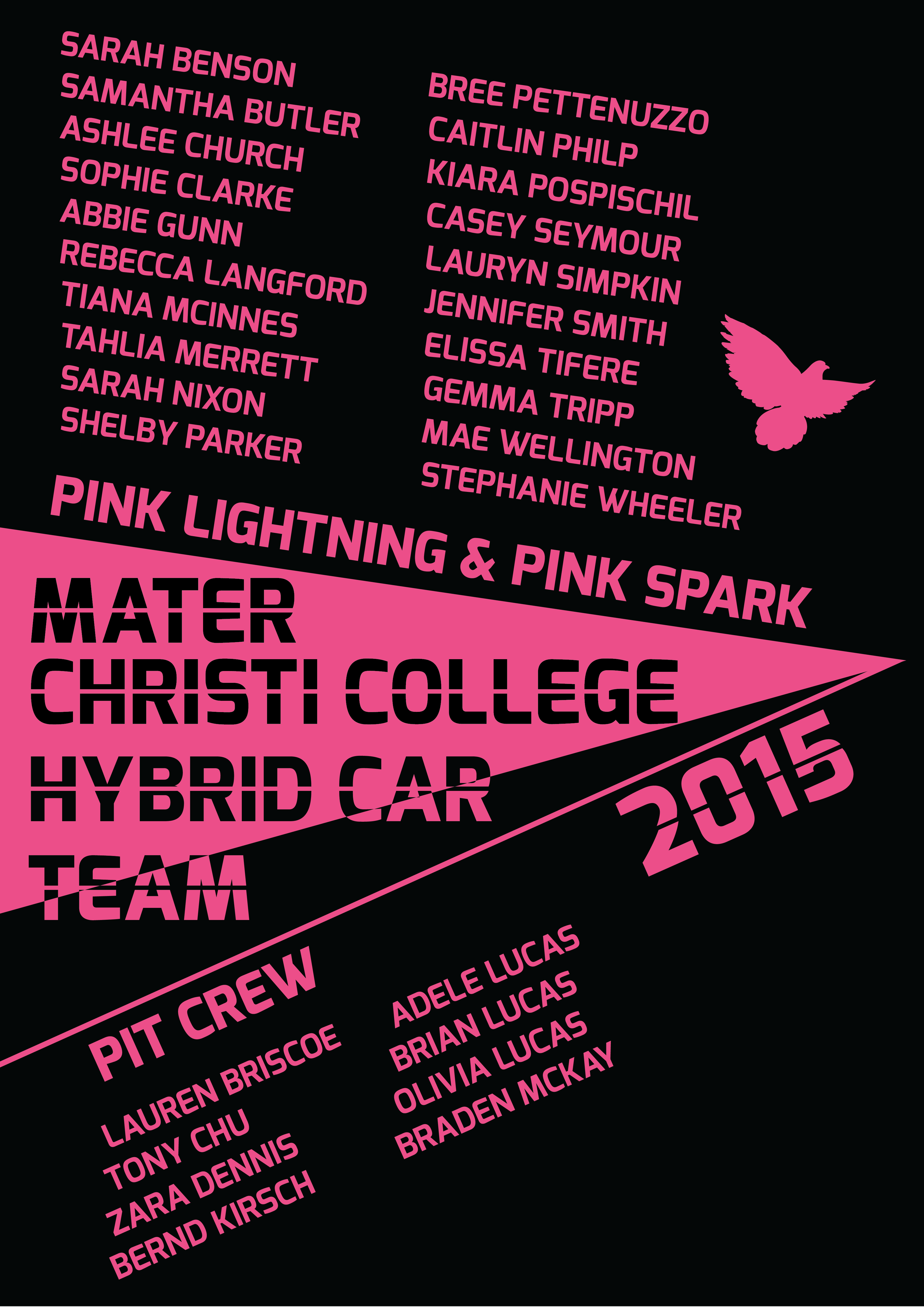 This year I was very lucky to be able to work with the hybrid car team teacher to create new logo for the team. The generation of ideas begun with considering the current logo design, physical forms of their hybrid cars, and brainstorming the client’s need. I wanted to emphasise the speed and the movement of the car, so I decided to tilt the angle of the car, forming a sense of perspective to the design. In order to represent the distinctive identity of hybrid cars, I incorporated the linear outline of one of two hybrid cars. The contour of a dove is the symbol of the school, which can be found in the school logo. As an application, the final logo design was applied to the back of pink overalls with black ink.
