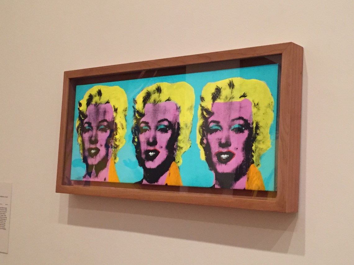 The famous Marilyn Monroe screen prints were presented as a series in a small scale – Three Marilyns (1962). While there are various colour combinations for the prints of Monroe, this tinted colour scheme was interesting as the mixture of reality and the fantasy was well balanced. The allocation of bright pink on the section of Monroe’s skin whimsically creates a disharmony with light yellow for Monroe’s blonde hair. This makes the audience see this series of prints a kind of satire or humour, rather than a portrait.