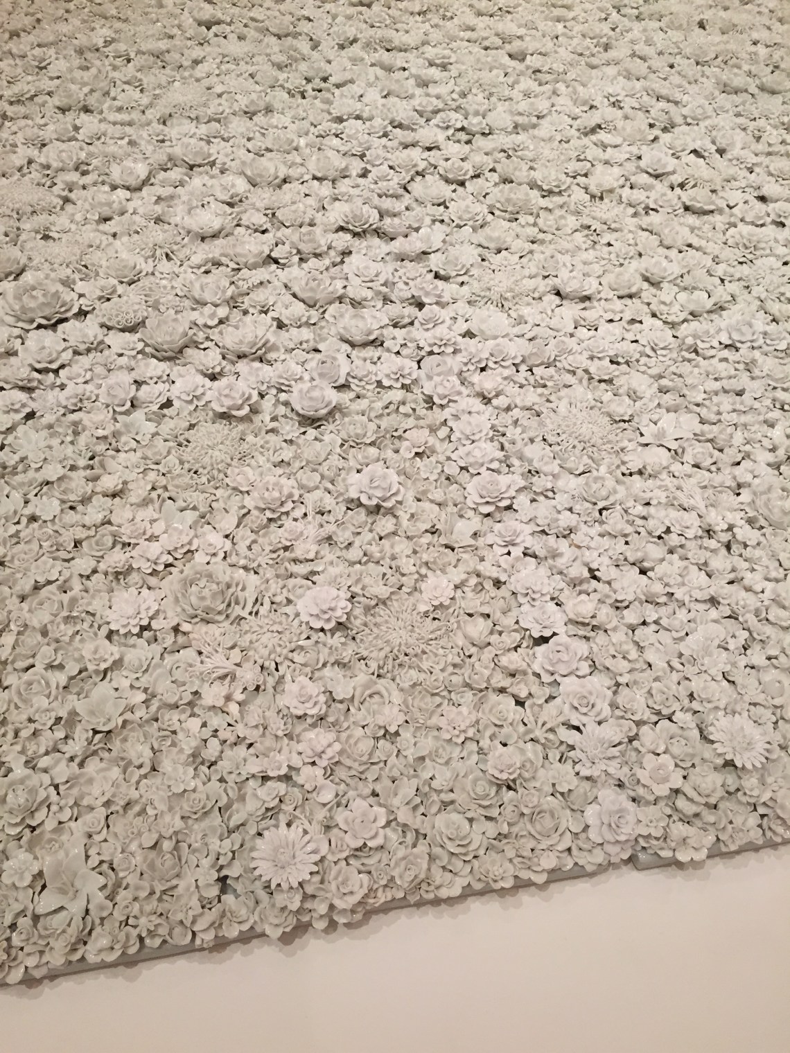 Blossom (2015) is an installation created with white porcelain. The garden bed full of flowers varying in scale, forms and species maintains the aspect of colour: white. This artwork was created in response to the Flowers for Freedom movement, reminding the audience of a significant number of people in the past and present who are struggling or struggled to acquire the freedom of speech or human rights. Utilising the art form of porcelain may be representing the resilience in the fragility of human being, symbolised as flowers. The complexity of the artwork made me wonder how it was made, and feel so overwhelmed by the time and effort put into the production.