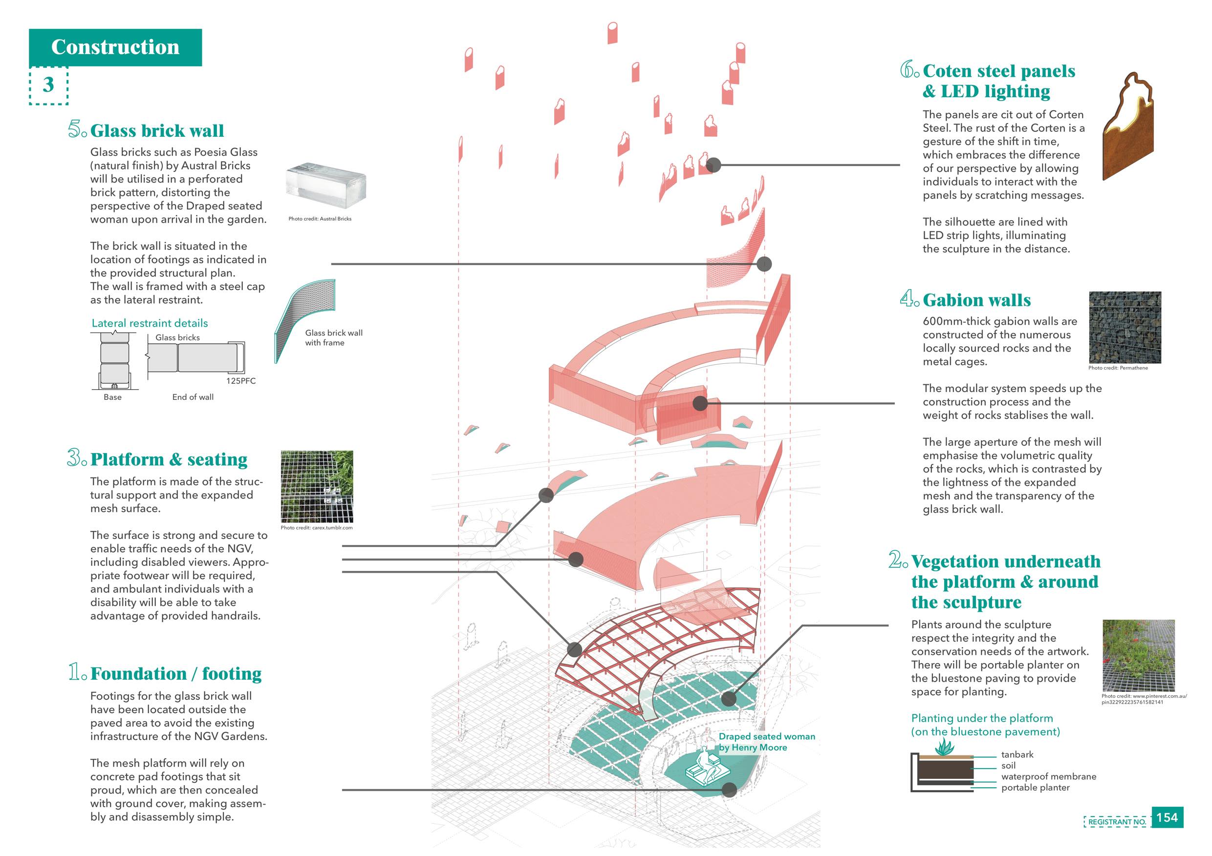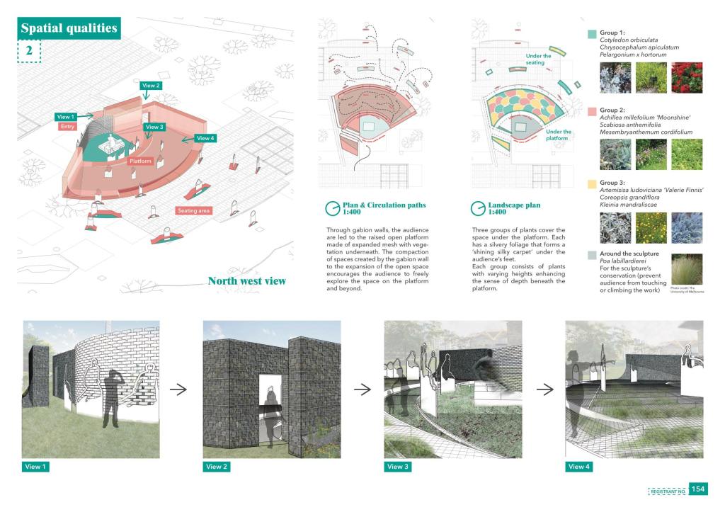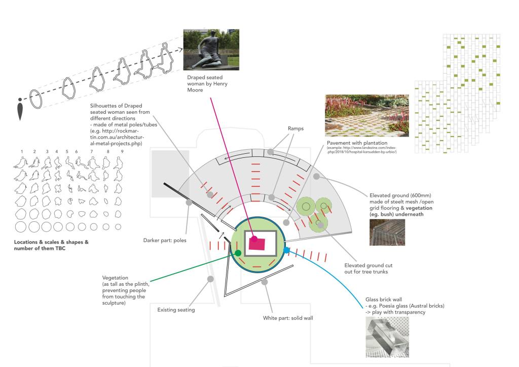 At this stage, the materials and design components are finalised. The design had been simplified to the expanded mesh platform with vegetation underneath, the transparent brick walls, gabion walls and Corten steel profiles with LED lighting. Materials play with the perception and the tactile qualities while the presence of the sculpture (Draped seated woman) is focused.