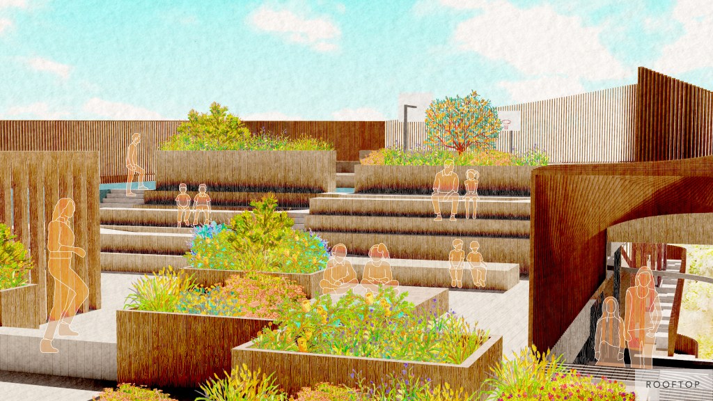 The rooftop garden and playground have integrated seating, ramp and planter boxes to create a transition from a semi-private intimate area to more open space for physical activities.