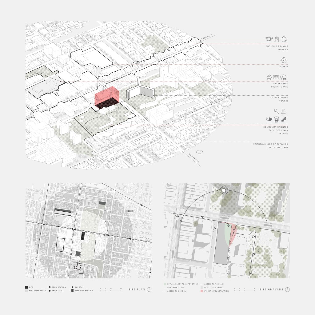 The site is located near the major intersection of Chapel Street and Malvern Road in Prahran. The site is adjacent to the large community facilities including a park, playground and a pool that the school can take advantage of. The site is in between the economic zone (commercial, civic and hospitality buildings) on the west side and residential zone (social housing towers and neighbourhoods of single detached houses) on the east side. In considering the design response to the site context, we decided to have a more open, welcoming gesture to the east side of the site where the local neighbourhoods are located.