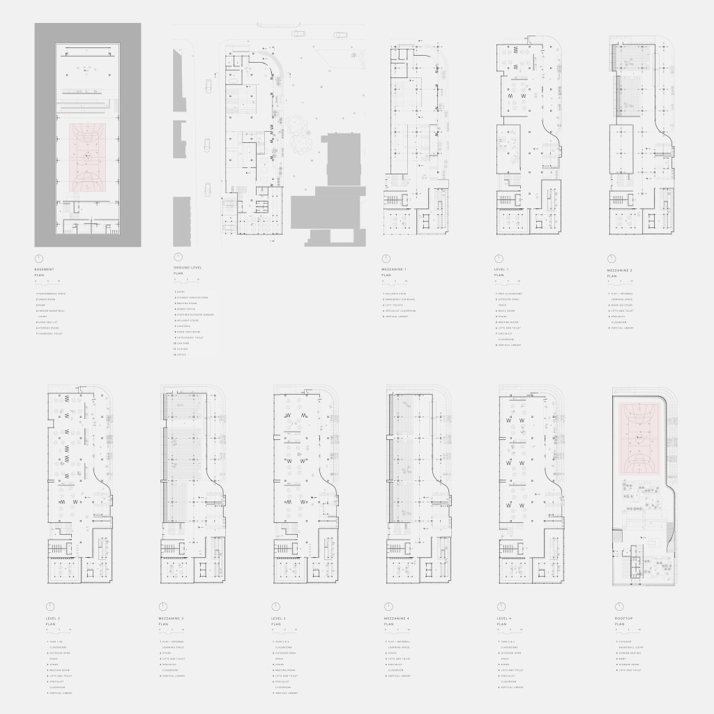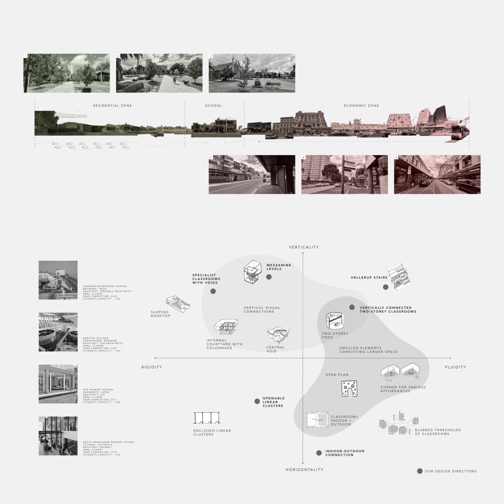 - Volume: segmenting the site into the classrooms on the north side and specialist classrooms and the vertical library on the south side.