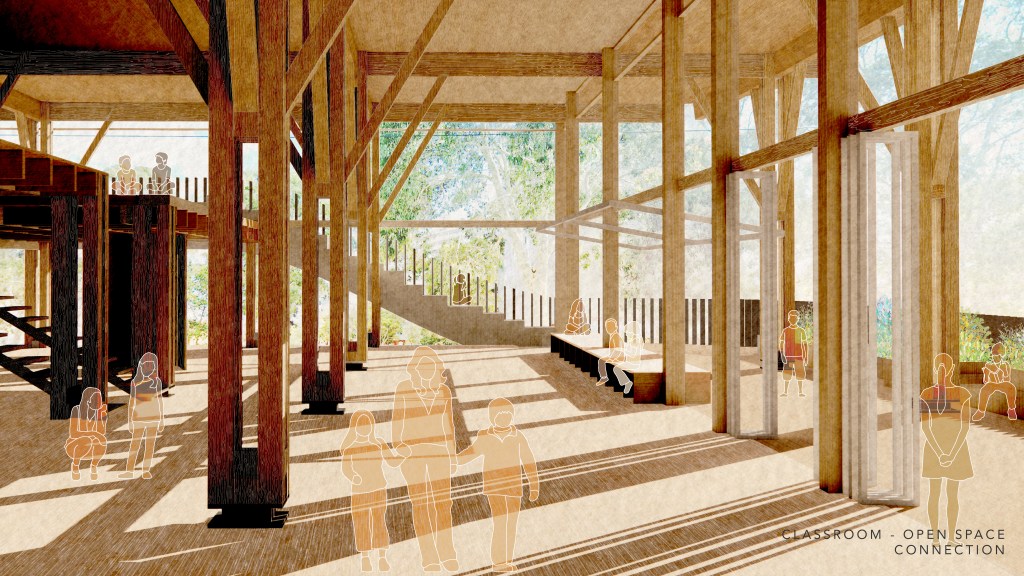 - Open space: strips of open spaces adjacent to classrooms, on the ground floor and on the rooftop. The open space and classroom area can be spatially connected by opening bi-fold sliding doors and tilt up doors, making the interaction with vegetation and outside accessible.