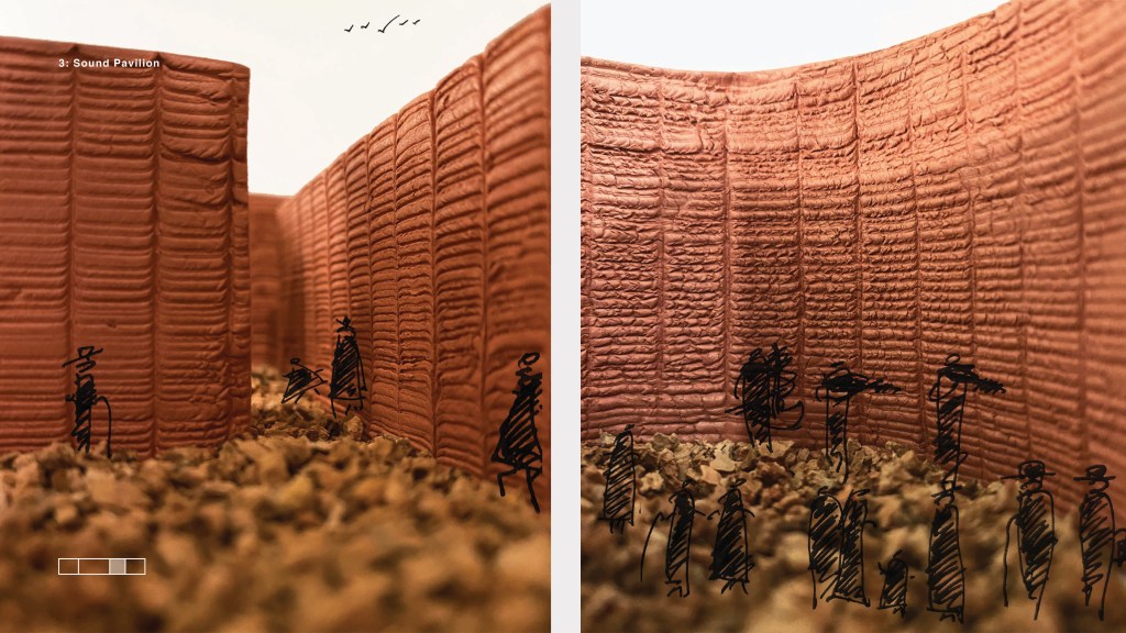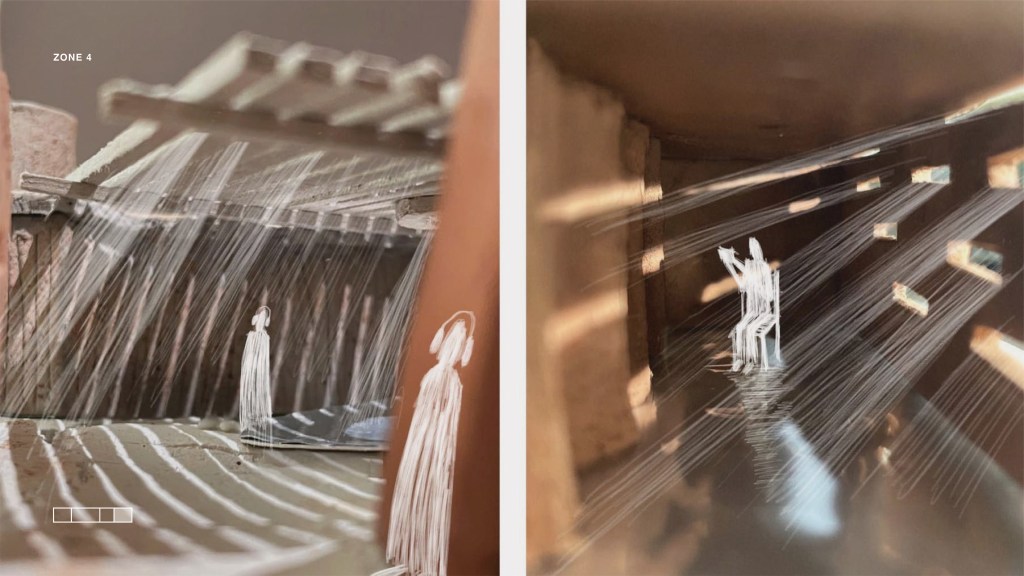 One of the favourite aspects of this studio was that the final deliverable was a series of physical models, photographed and stitched together. It was the first time I didn’t produce any presentation orthogonal drawings – it was so thrilling that physical models were all we had to communicate spatial compositions, programs and sensory experiences. We also decided to overlay illustrations of people and plants to suggest what it’s like to be there.