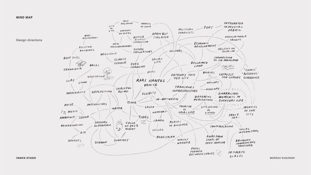 After the discussions based on the initial research and analysis, we felt that we need a clear design direction that directly responds to the site context. The first mindmap appeared “too pretty” according to studio leaders – we agreed that we need something that is beyond a mere “sensory experience”, something inherent to the place. The development of this mindmap throughout the process reflected how we evolved our ideas and eventually clarified what we were trying to achieve. Another feedback we received was to speculate the future of the site and surrounding areas. It made us broaden our attention to the issues and challenges local people are currently facing – namely, over-tourism, the heavy economic dependence on it, and the subsequent loss of the local population. We also considered climate change and the sea level rise, but we didn’t want to respond to them with engineering solutions.