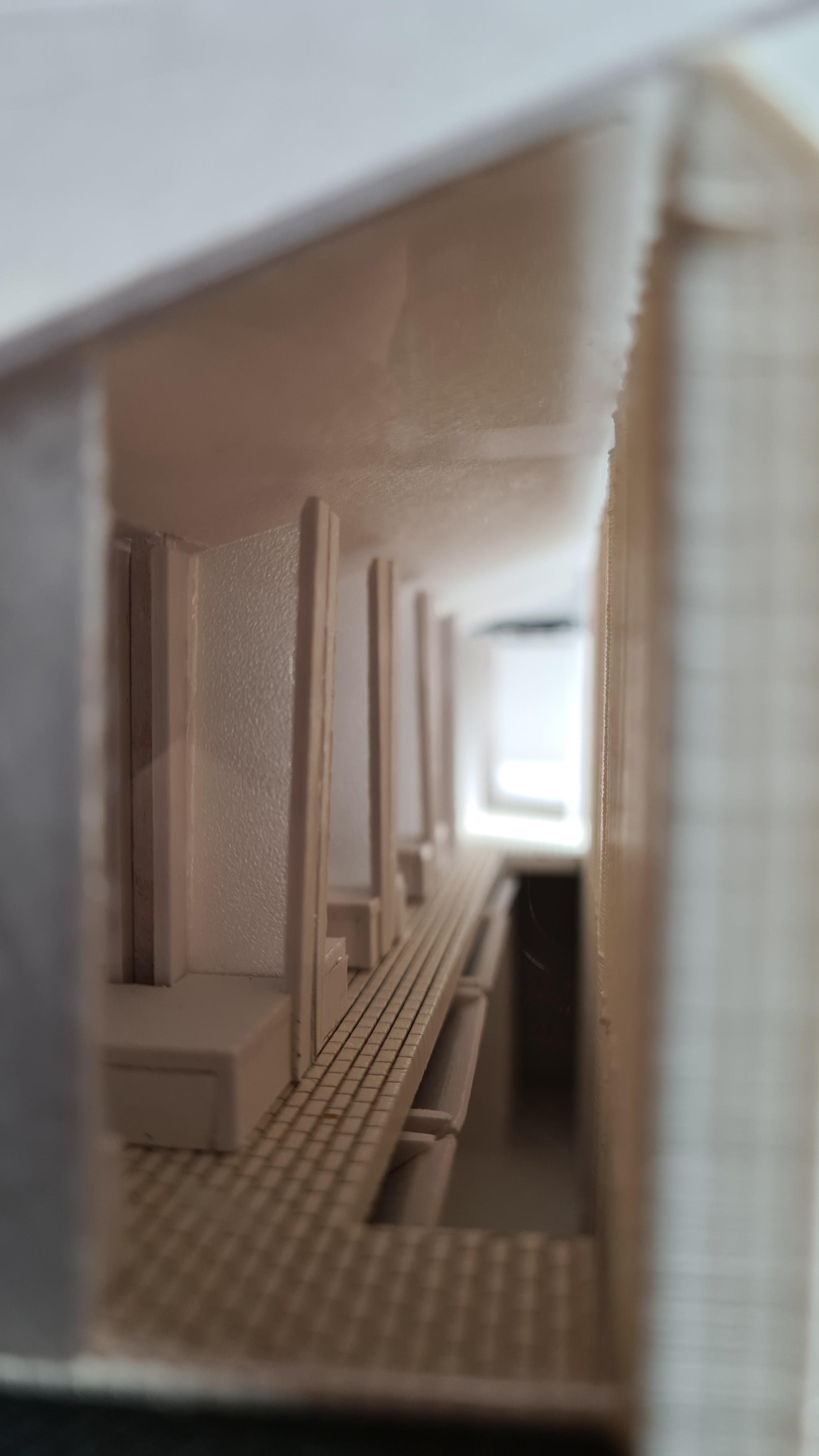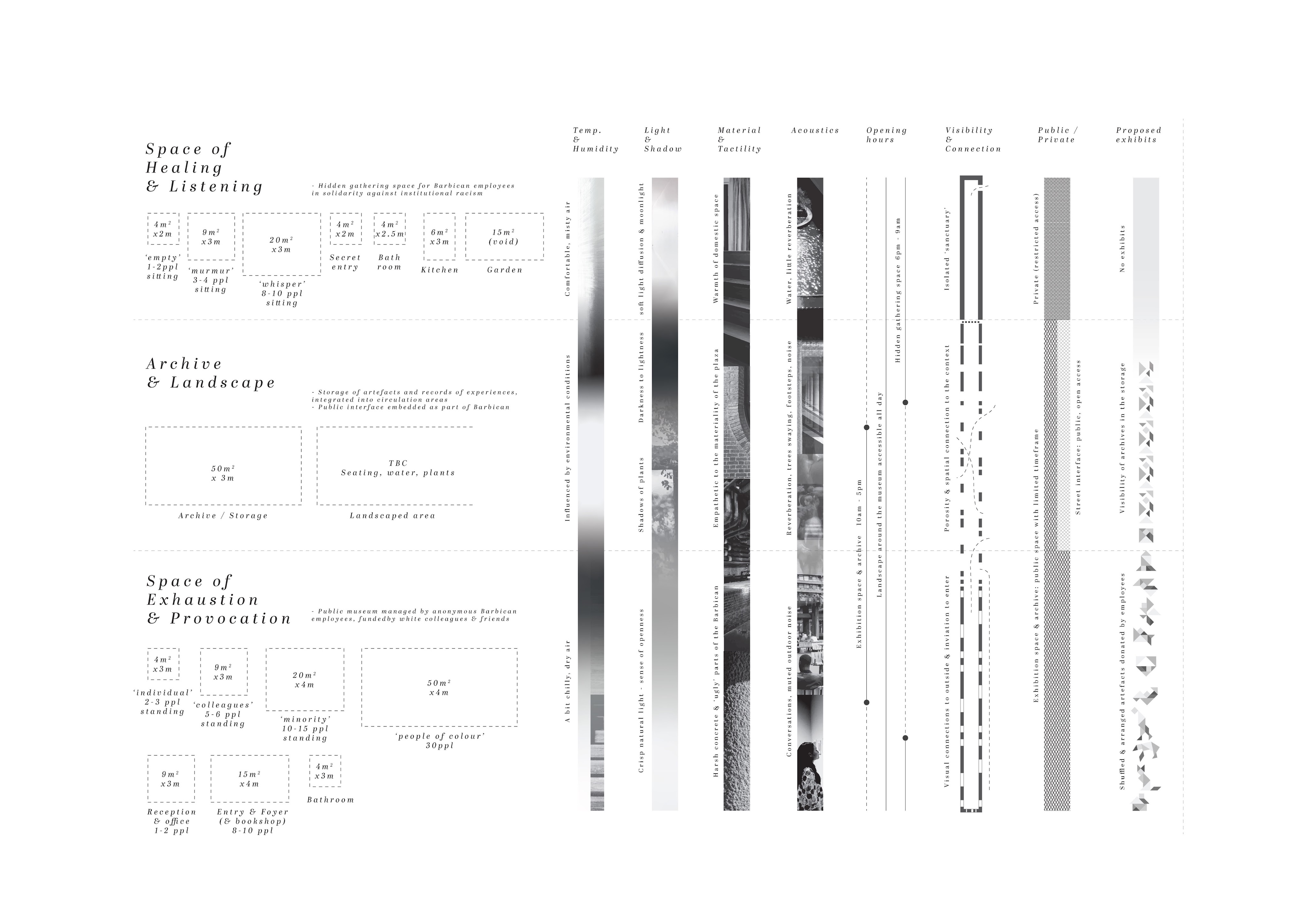 While it is common in design studios for students to write their own return briefs to set appropriate scopes and narrow down the themes explored, they tend to become a list of spaces and functions with pragmatic needs rather than the overview of intended spatial qualities. For my project in Studio 02, I learned to create a matrix of the characteristics that make key spaces distinctive from each other. This ‘phenomenological profile’ included not only the functional roles, but also acoustic experiences, tactility, light and shadow, temperature and humidity, public and private, visibility and connection, and access. It helped me consider the intricate relationships between pragmatic and sensory aspects of spaces before coming up with designs – in other words, I had a clear idea of what I was intending to achieve through design, and therefore this brief became an anchor for making design decisions. I knew if the design was going off track when it wasn’t responding to this brief. I printed out this phenomenological profile in A4 and utilised it throughout my design process, always reminding myself to go back to the basics whenever I got stuck.