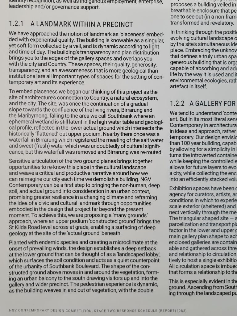 As I’m not a curator of contemporary art exhibitions, I can only deduce from an architectural point of view. The difference in conceptual attitudes between the winning design and finalists may have been the extent to which the building actively imposes control and affects the nature of exhibitions. Of course, how the narratives of artworks are told through the eyes of curators also shapes exhibitions and visitor experience. However, the winning design has a powerful, almost forceful spatial influence on what exhibition spaces could become. After all, its effectiveness is something we can’t evaluate until the NGV Contemporary is open.