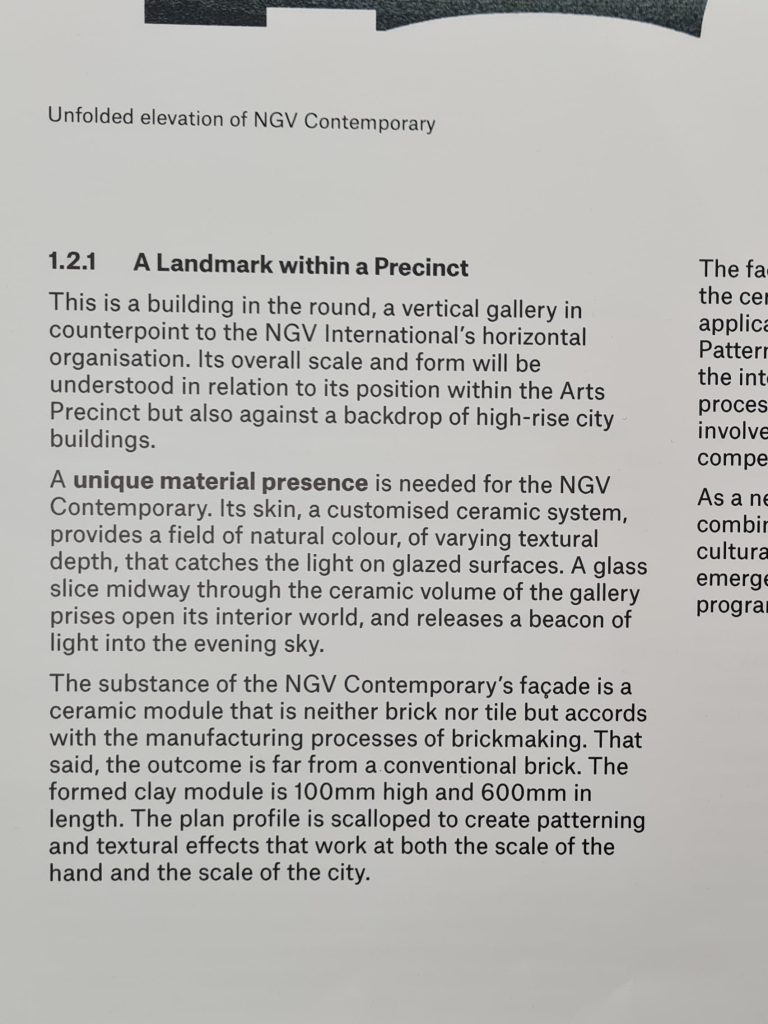 The substance of the NGV Contemporary’s facade is a ceramic module that is neither brick nor tile but accords with the manufacturing processes of brickmaking. That said, the outcome is far from a conventional brick. The formed clay module is 100mm high and 600mm in length. The plan profile is scalloped to create patterning and textural effects that work at both the scale of the hand and the scale of the city.