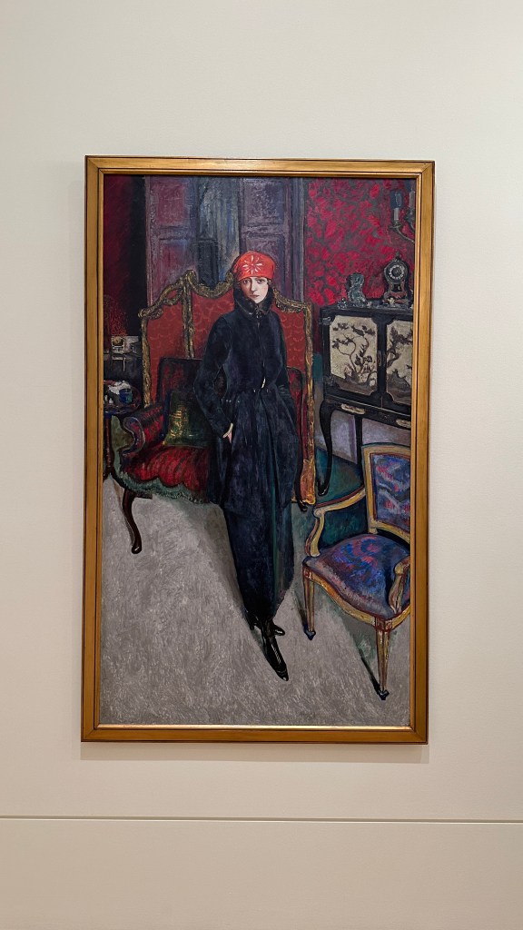 Having two portrait paintings on a vast wall, Principia and her pet by Paulina Olowska (part of Triennial) and Mrs Fairbairn (Nancy Cunard) by Alvaro Guevara (from the permanent collection) in the International Painting on Level 2, sandwiching an entry to the next exhibition space between them, forms a direct comparative relationship in terms of the figure’s interaction with depicted internal spaces. While both paintings feature a female figure respectively as the focal point, they embody contrasting characters: Guevara portrays Cunard as a strong, independent woman ready to leave the confining, seemingly oppressive room, while Olowska paints a ‘titular… glamorous school principal’ with a pet dragon in a room full of dragon artworks that suggest her control over the interior. Observing two paintings in parallel gives a new perspective on the role of interior space, colour palette, and subtle movement effects created by slight differences in framing angle. The observation brings the viewer to notice the expansive scale of the exhibition space itself, further reinforcing the sense of confinement captured in the paintings.