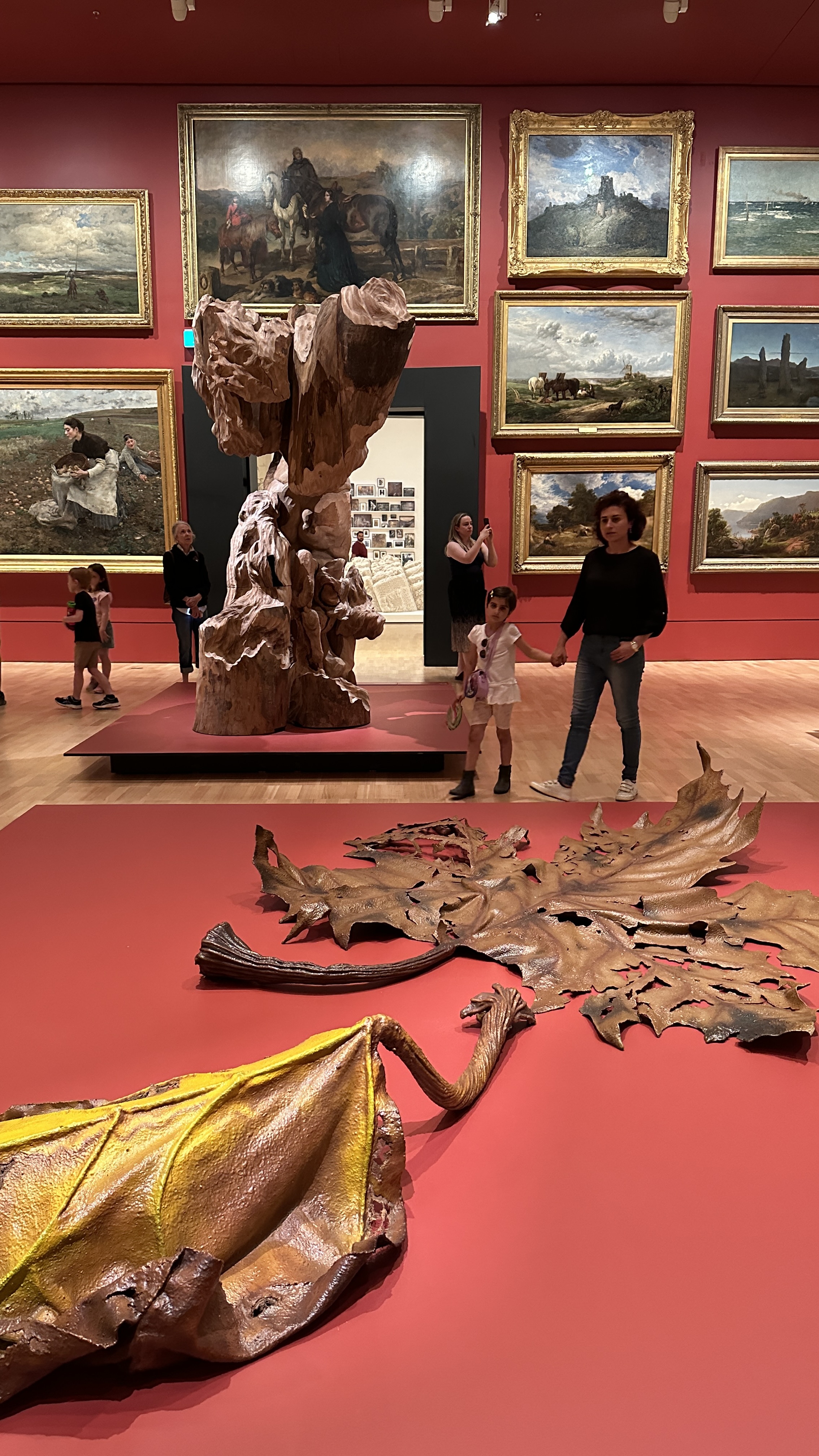 The installation of Triennial in the Salon Gallery, known for a myriad of 19th-century European oil paintings covering the entire red walls, became an immersive space for questioning the status quo concept of permanence and the narrative around landscape, individuals and societies. Several works were integrated into the Salon as part of Triennial, including the hidden order of the whole (Venus) by Todd Gray, which directly engaged with a somewhat oppressive sense of ordered painting frames through overlapping photographs, Fell by Ashley Jameson Eriksmoen and works of enlarged leaves by Joshua Petherick and Lewis Fidock, which material representation contrasted vividly against the confined, composed nature of paintings, and Glowing Pains by Shara Hughes that highlighted the complexity of personal mental space through a depiction of landscape. Through the insertion of Triennial works that deal with psychological, temporal, environmental, and historical subject matters, curators effectively articulated the shifting perspectives on Western art of colonial times and the spatial nature of the Salon in resonating with works of such period.