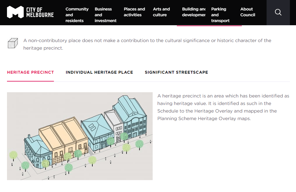 As I continued exploring sites of local heritage significance, I found the heritage grading that distinguishes different levels of heritage contribution interesting. In particular, the grade ‘Not contributory’ given to buildings within heritage precincts but without contribution to heritage significance is fascinating:
