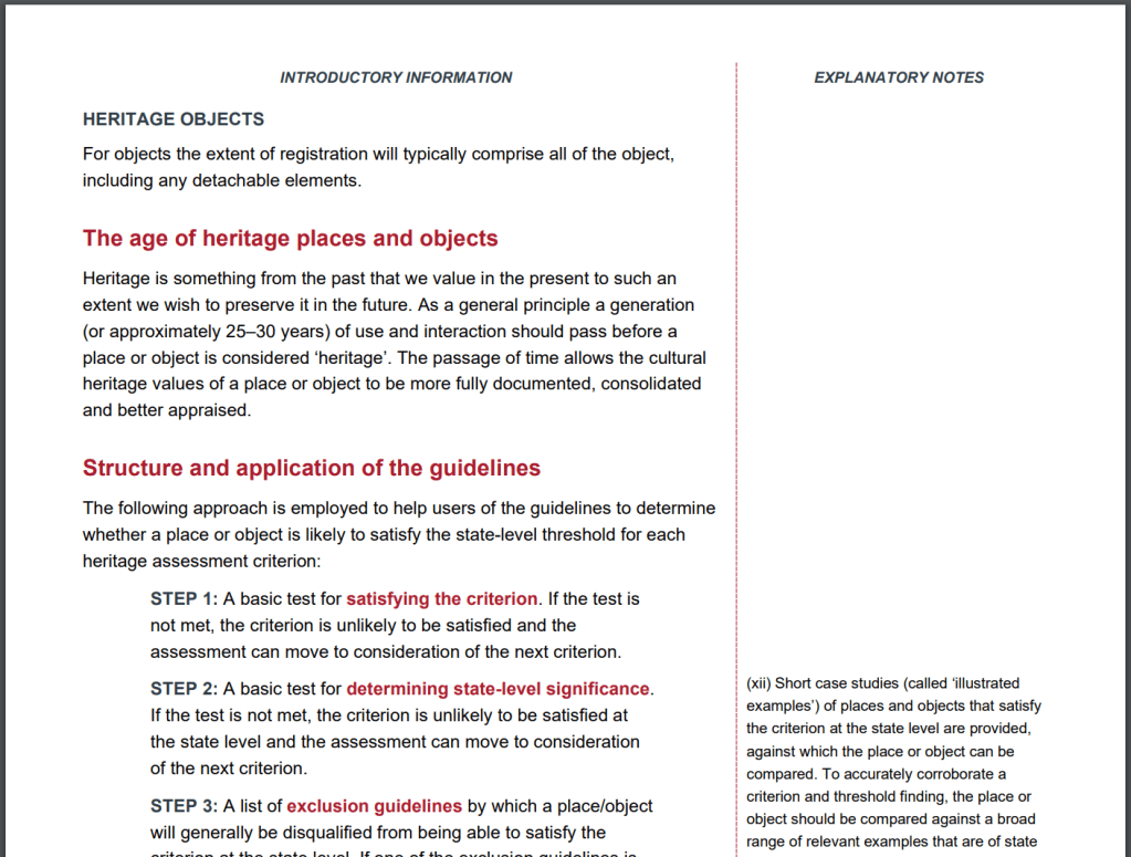 Here, the verb ‘to justify‘ suggests something other than the nature of the building itself; the passage of time may not simply be for the heritage values to become apparent, but more importantly, the evidence of the heritage values to be formalised. For example, for a place to be added to the national heritage list, its heritage impacts on the country broadly need to be demonstrated, which could take a longer time to be appropriately documented compared to a place of local significance. Having said that, searching through locally significant places suggested that individually significant sites included in local heritage overlays seem not necessarily be more recently built than state-registered sites; it’s interesting to imagine whether, in reality, it’s easier to collate evidence for a new state heritage site than a less known local heritage site with limited documentation.