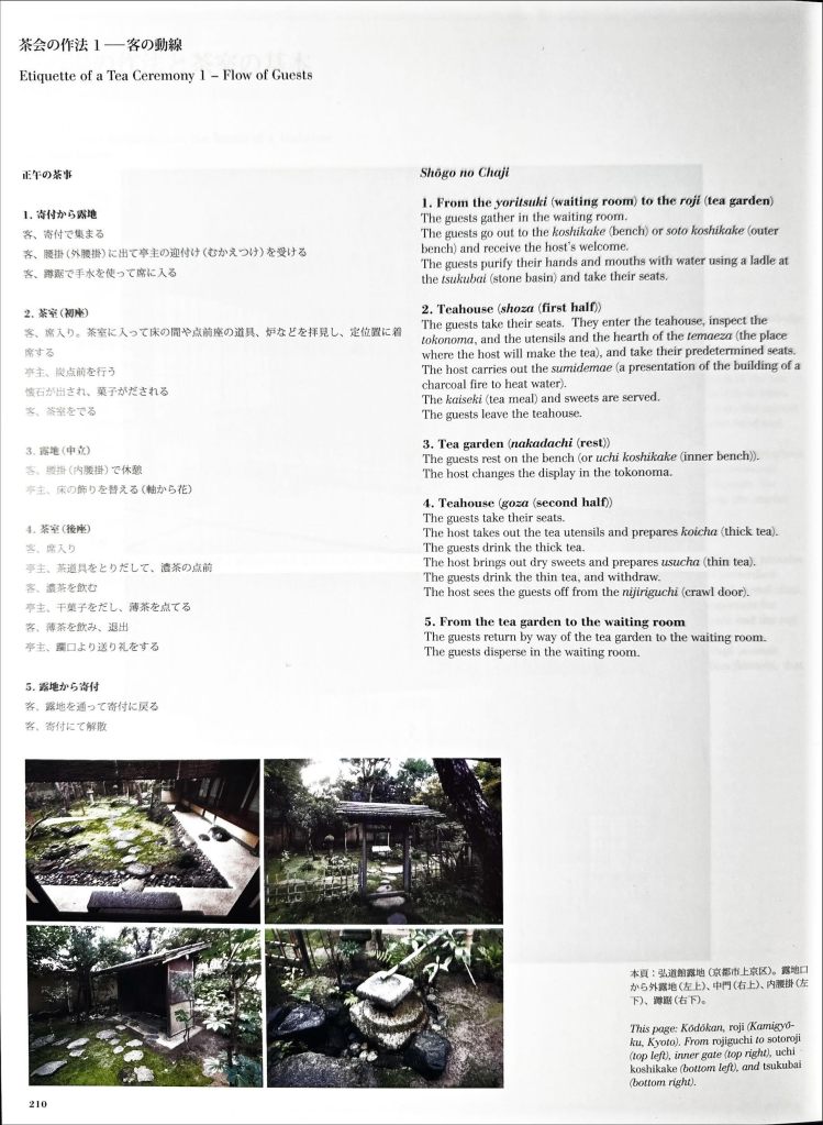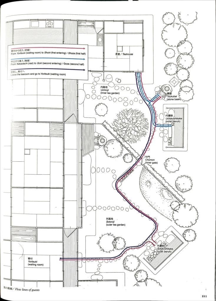 Regardless of the scale, gardens are often designed to invite specific human behaviours and interactions with places and experiences. In such cases, factors such as human movements (speed, points for pause and actions, passage, etc.) impose design constraints on garden designs. A type of garden that must meet highly detailed spatial and experiential requirements may be the garden of a Japanese tea house. The book 33 Japanese Teahouses: From Rikyu and Enshu to Modern Times by Architecture and Urbanism includes pages describing the Etiquette of a Tea Ceremony using Kodokan roji (Kamigyo-ku, Kyoto) as an example, drawing out the circulation paths of guests from the waiting room to the tea house, out to the garden during the interval, and the return to the waiting room from the tea house after the ceremony. Plants, stones, built elements (such as fences, a stone basin and benches) and ground conditions are infused with meanings respectively and collectively. The garden becomes more of a composition of elements where spatial relationships between them are meticulously controlled by design, but not necessarily the forms of plants per se. Although the formality of the tea ceremonies adds a layer to the way elements are curated, their textures, forms, and materiality are embraced in a way that celebrates temporality and graceful aging, relating deeply to the spirit of tea ceremonies. It reflects the cultural practices and philosophical attitudes towards gardens unique to the history of Japanese tea house designs.