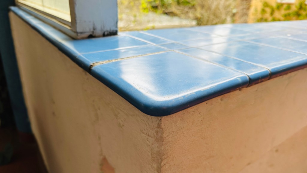 The colour scheme of the foyer and circulation space is kept simple yet rich. Matt finished bright marine-blue bullnose tiles are used on cylindrical columns, lift door reveals, and wide verandah ledges, offering a fresh Mediterranean feel. Additionally, the burnt orange (red sandy) concrete paint beautifully complements the greenery in the communal courtyard and the potted plants in front of the flat entries.