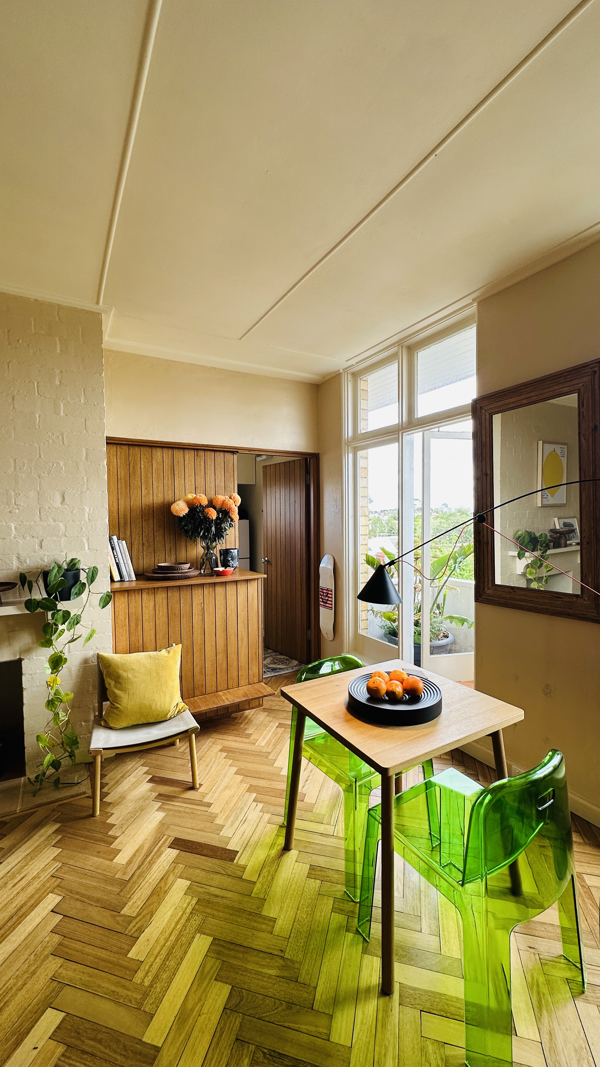 Inside the flat, restored to the original state by Tony Lee, was phenomenal. The apartment was full of joinery fun, including a Murphy bed with fold-out side tables, a cabinet whose top becomes a bar counter, a fold-out ironing board, a lower open carcass for storing a bar stool, and lots of storage cupboards. In particular, I loved the joinery units that function as part of a wall, serving both sides: some drawers are on the kitchen side, while storage cabinets are on the living space side, staggered to hold both.
