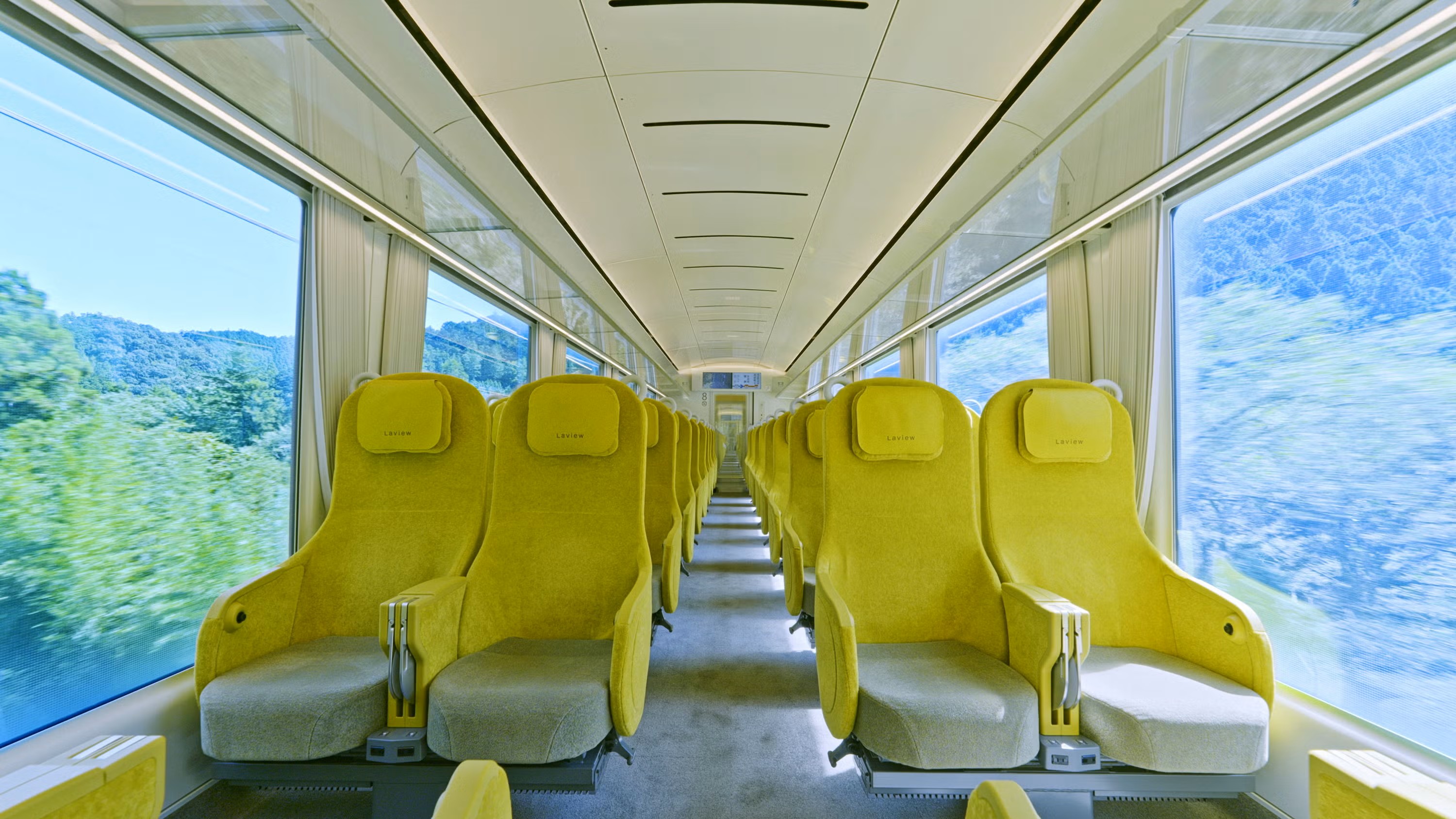 A train seat with a landscape, as relaxing as a ‘living room’, and as a destination.
