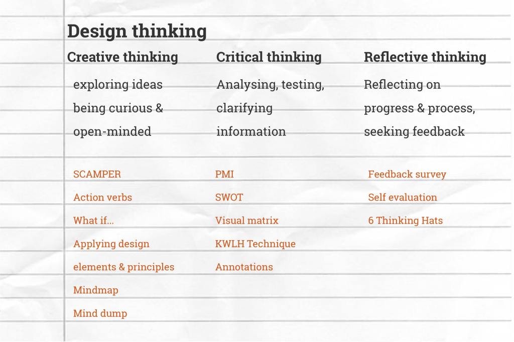 Design thinking is a group of thinking methods that help you throughout the design process – although you MUST demonstrate that you can apply design thinking techniques, at their core, they are essential ways of thinking for any kind of projects you do.