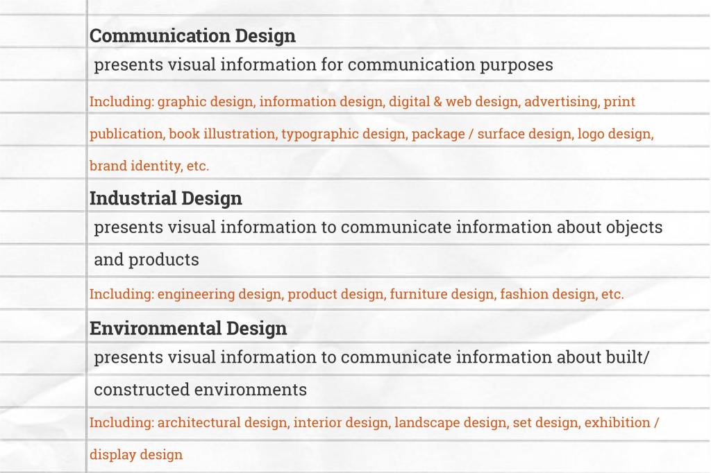 There are three categories of design, and you will need to decide what your presentations will focus on based on these categories. You can choose two distinctive presentations from one of three categories, but most of students choose two categories (e.g. communication design and environmental design).