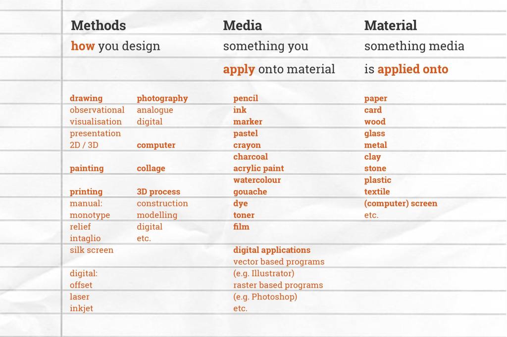 You’ll hear ‘methods’, ‘media’ and ‘material’ so many times, so let’s clarify what each of them means. The lists below are some of the examples of methods / media / materials, however there’s no limit to what you can use. (reference: study design 2013-17)