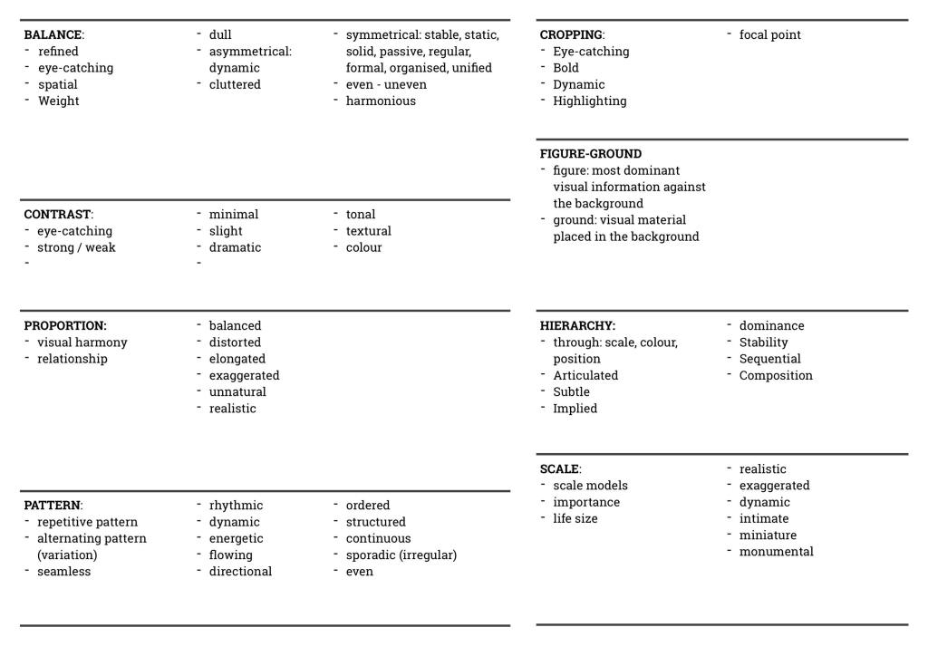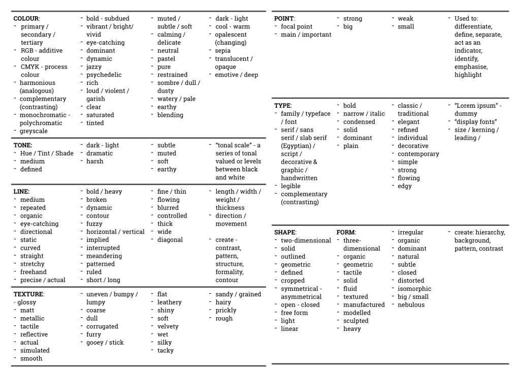 Make your own cheat sheet of Design elements & principles to refer to whenever you write.